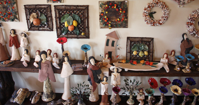 Dionysia aime son île. Toutes ses créations sont inspirées de la nature, de la vie, de la tradition, de la couleur et de l’odeur de Zakynthos: branches d’olivier en céramique, poissons et tortues, dames en céramique inspirées de la vieille Zakynthos sont juste quelques unes de ses collections.